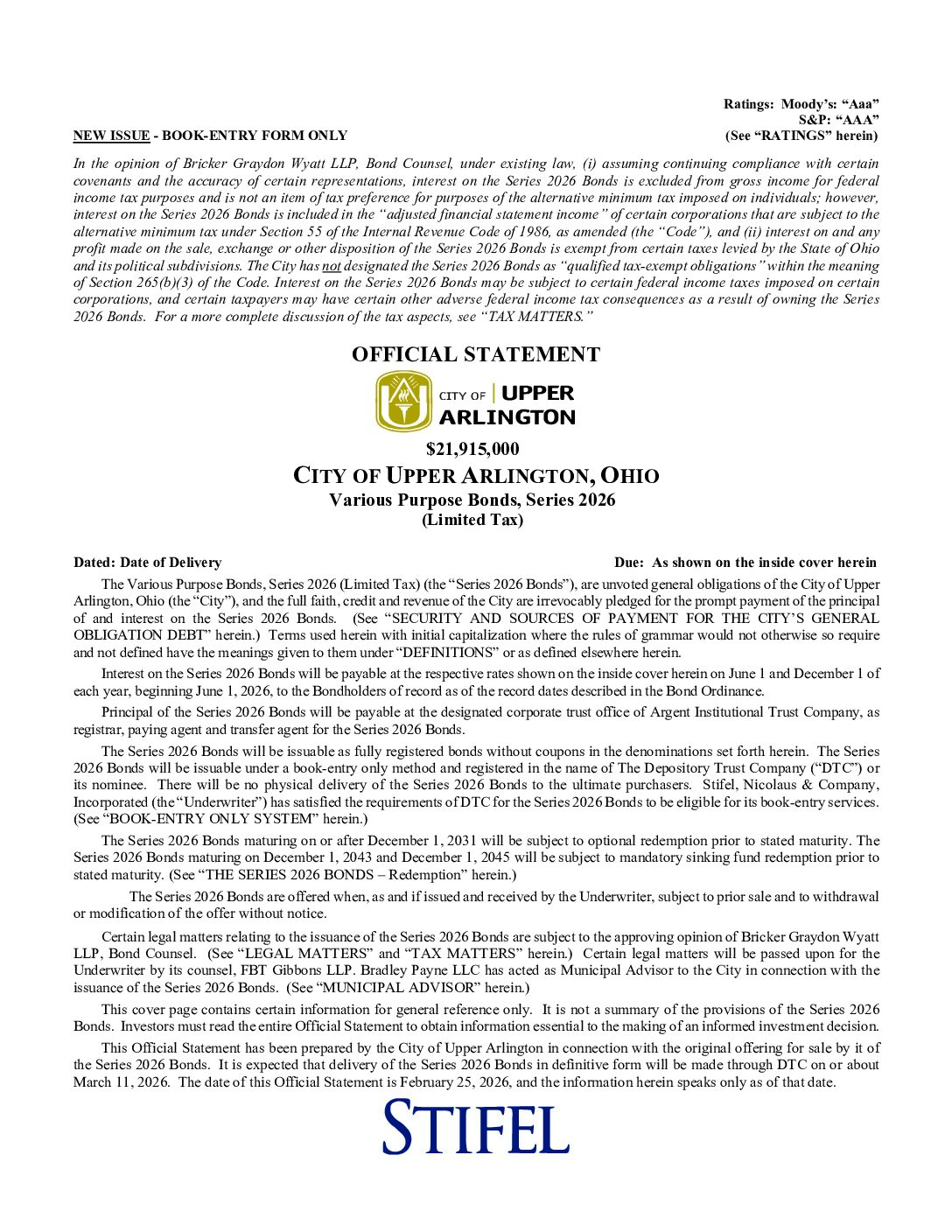 $19,000,000 CITY OF SANDUSKY, OHIO General Obligation (Limited Tax) Recreation Center Construction Bonds, Series 2026