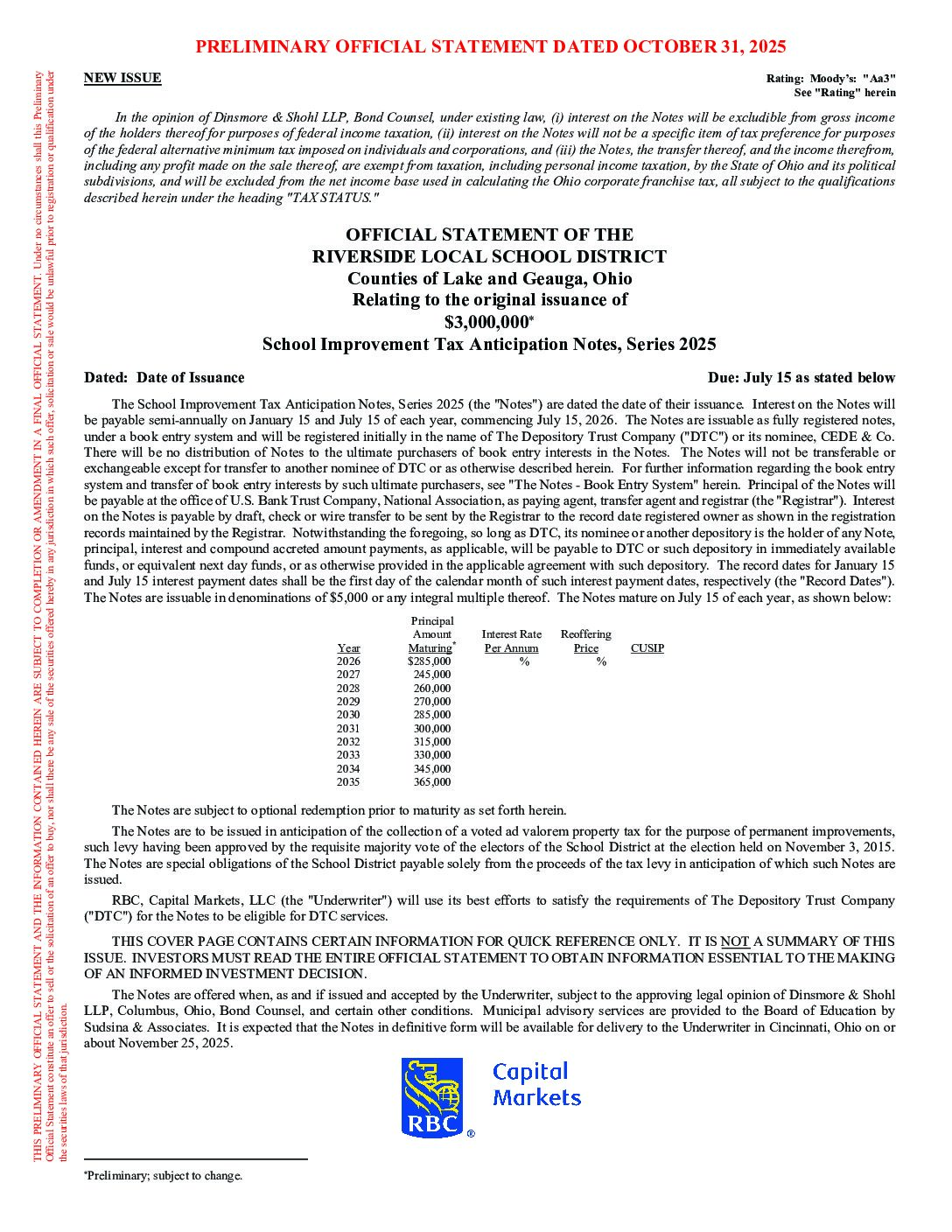 OFFICIAL STATEMENT OF THE RIVERSIDE LOCAL SCHOOL DISTRICT Counties of Lake and Geauga, Ohio Relating to the original issuance of $3,000,000 School Improvement Tax Anticipation Notes, Series 2025