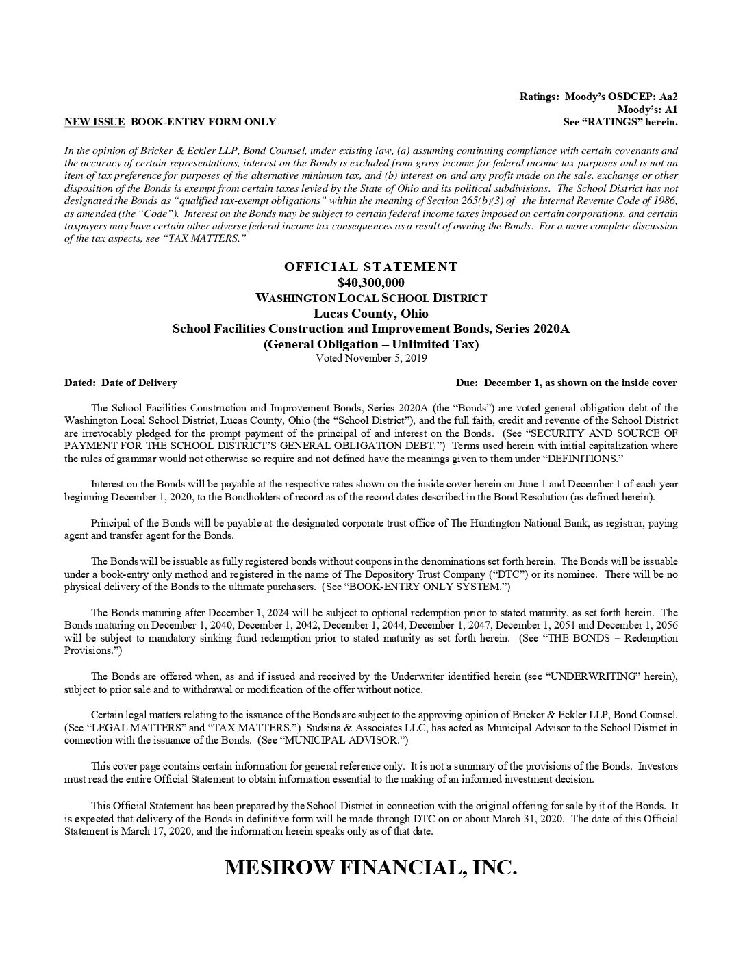 OFFICIAL STATEMENT $40,300,000 WASHINGTON LOCAL SCHOOL DISTRICT Lucas County, Ohio School Facilities Construction and Improvement Bonds, Series 2020A (General Obligation – Unlimited Tax) Voted November 5, 2019